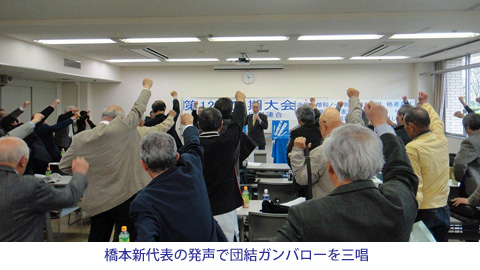 新役員を代表して橋本勝六代表は、「国民生活が抱える課題は山積している。社民党は一貫して安全・安心の社会、平和憲法を守る方針を掲げてきた。主張は正しいが、筋論だけでは国民の支持と信頼は獲得できない。市民生活に密着した活動で、消費増税と原発再稼働に反対する闘いをつくりたい。次期総選挙の候補者擁立は厳しい環境であるが可能性を求め検討していきたい。また、地方自治体議員の拡大にも取り組んでいかなければならない」と挨拶しました。最後に、党の前進を誓い団結ガンバローを三唱し大会を終了しました。