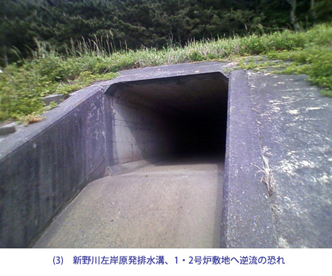 【1】立地条件について 場所としての欠陥要因は、以下の三つに大別される。 (1)浜岡原発で事故が発生した場合、東名高速道路、JR東海道線、国道一号線等々の物流機能が寸断され、新幹線にまで災害が及ぶと日本経済に重大な影響を与え、浜岡に原発を作ったことは過ちである。 (2)西に新野川、東に筬川(おさがわ)の間にはさまれて原子炉建屋があることはまさしく砂上の楼閣である。東海地震の震源域であり、その上、南海地震、東南海地震との連動も予測されている。津波が川を逆流することは、3.11地震で北上川を5キロも逆流して、大川小学校の生徒さん達に多くの犠牲者がでたことは記憶に新しいところである。 (3)浜岡砂丘で有名な浜岡地方一帯の沿岸部はすべて砂浜である。浜岡の砂の特長は、軽くて粒子が細かく、粘着力が無く、水に対する抗力が弱く、堤防構築の素材として不適当である。又、水の影響を受けやすく水流に併せて狭いところでも簡単に流入し、流出もするのでプールや配管に浸入したらその機能を失う。 【2】土木技術者としての見解 浜岡原発周辺の調査を4月に1回、5月に2回(その後7月に2回)、計5回実施し、その時写真を撮ってきたので、その写真に基づいて説明する。 1 右岸の堤防下には東芝があり、堤防を越えた津波は原発調整池の先、5号炉直近までの大きなプールになることが予測される。もし事故対応のバックヤードとして想定しているなら再考の余地ありと考える。